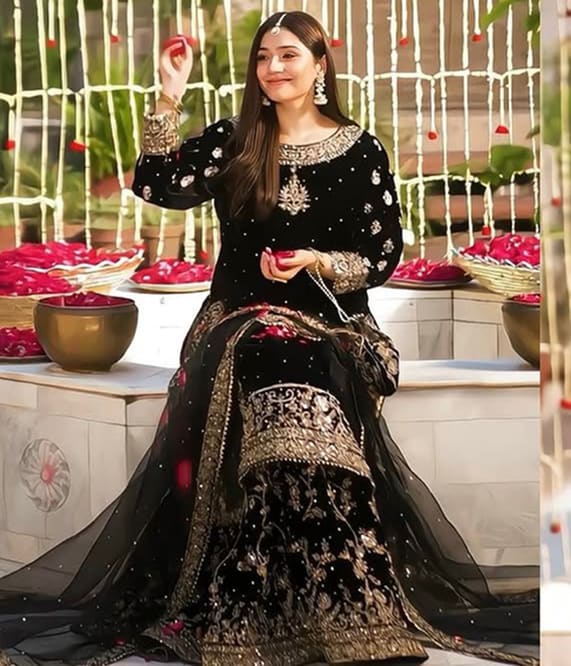 This luxurious Sharara set features heavy 9000 velvet fabric adorned with fine embroidery and Chinese sequence work for a royal look. The fully stitched, free-size Sharara (39 inches) ensures comfort with elegance. Paired with a heavy faux soft net dupatta, embellished with embroidery, sequence detailing, and rivet moti handwork, it adds a graceful charm. Perfect for weddings, festive occasions, and parties, this ensemble beautifully blends tradition and glamour for an effortlessly elegant appearance.